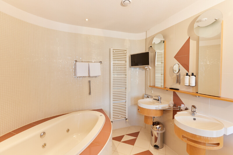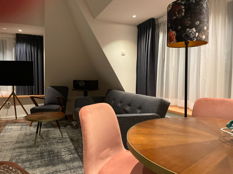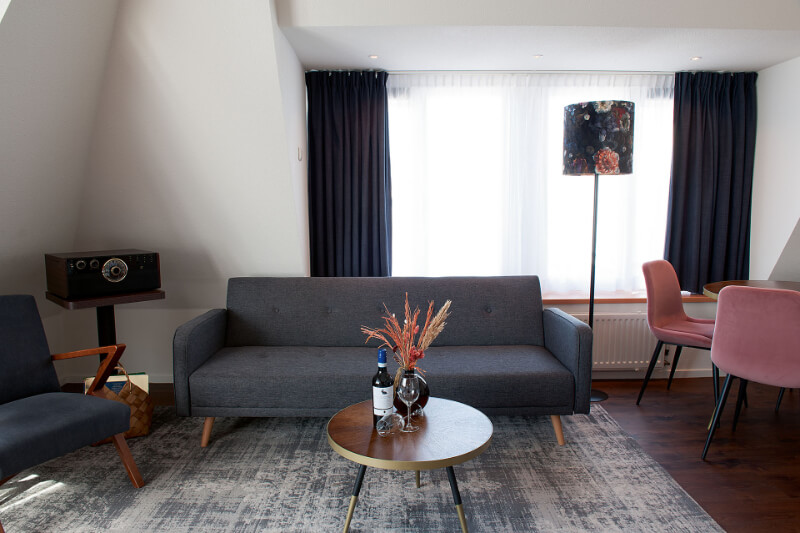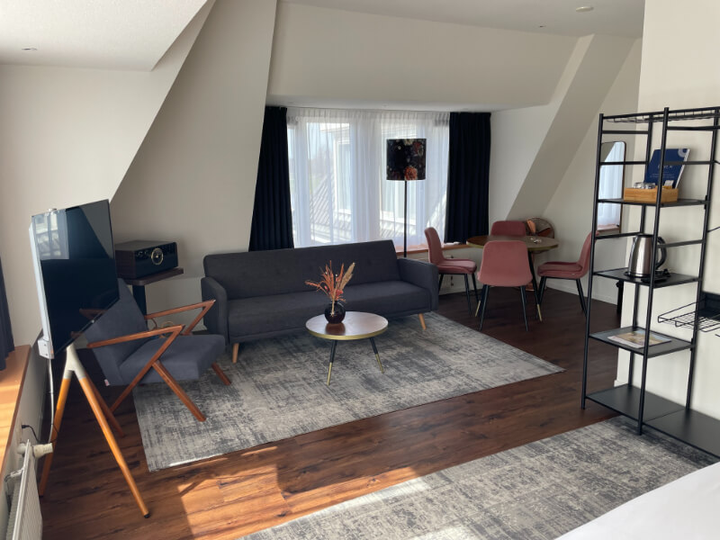 Of je nu wilt ontspannen, werken of quality time met de familie of je partner wilt doorbrengen – deze modern ingerichte Junior Suite biedt het allemaal. Met een ruime zithoek, een apart werkgedeelte en een luxe whirlpool is dit de perfecte plek voor elk type verblijf. De suite is ook zeer geschikt voor families en kan op verzoek zelfs worden ingericht als romantische bruidssuite, compleet met sfeervolle details om jullie speciale dag extra onvergetelijk te maken. De suite is van alle gemakken voorzien voor een heerlijk comfortabel verblijf. De suite is uitgerust met een ruim tweepersoonsbed, inclusief twee hoofdkussens per persoon. De suite biedt de mogelijkheid om extra bedden bij te plaatsen. De badkamer is uitgerust met een whirlpool en douche, wasbak, toilet, toiletpapier, handdoeken, een föhn en supplies van Marie Stella-Maris. In de kamer is verder aanwezig: een zitje met comfortabele stoelen of bank, een werkgedeelte, gratis draadloos netwerk, kledingkast met hangers, thee- en koffiefaciliteiten, tv met radiofunctie, telefoon, ventilator (op aanvraag), wekservice (op aanvraag), strijkplank met strijkbout (aanwezig op de gang), wasservice (tegen betaling), roomservice (tegen betaling), op sommige kamers is een patio aanwezig.