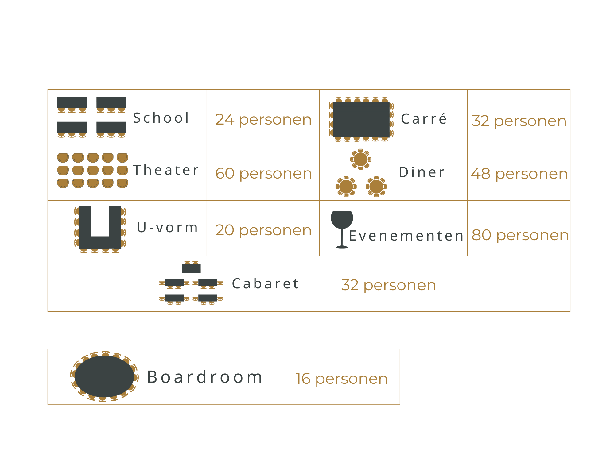 Bekijk hieronder de verschillende zaalopstellingen die mogelijk zijn in de Vecht Boardroom en de Greenhouse.